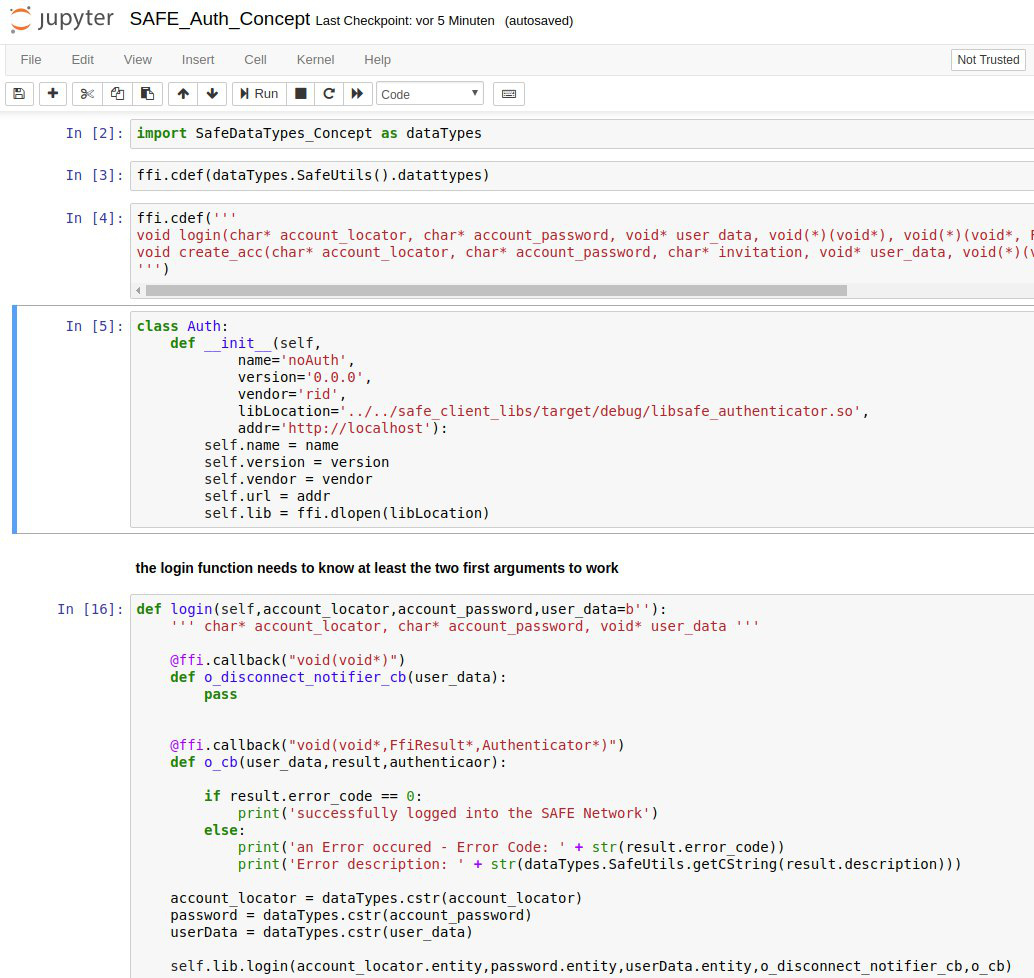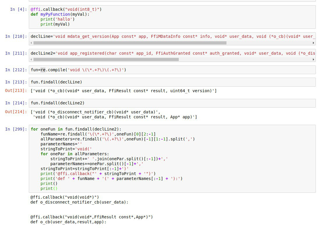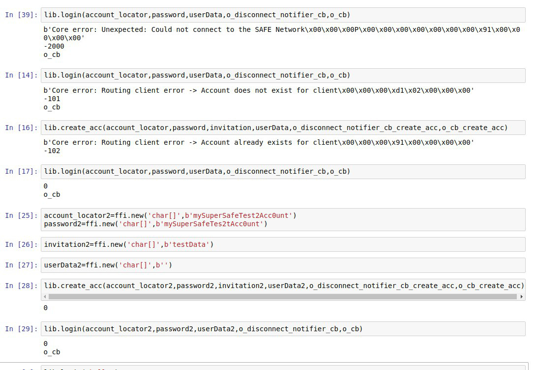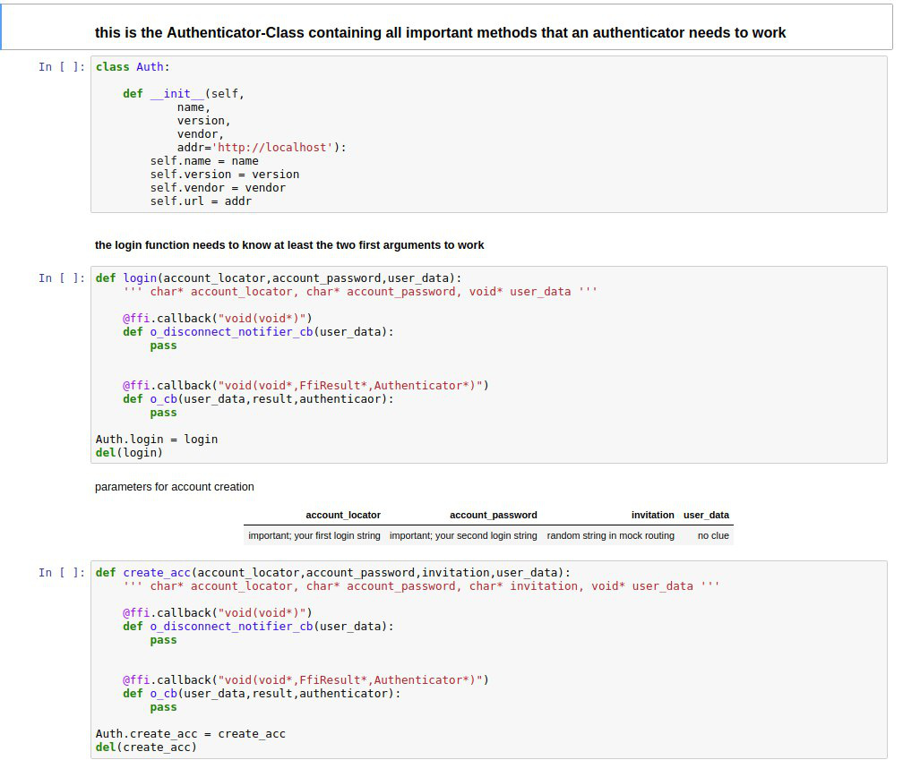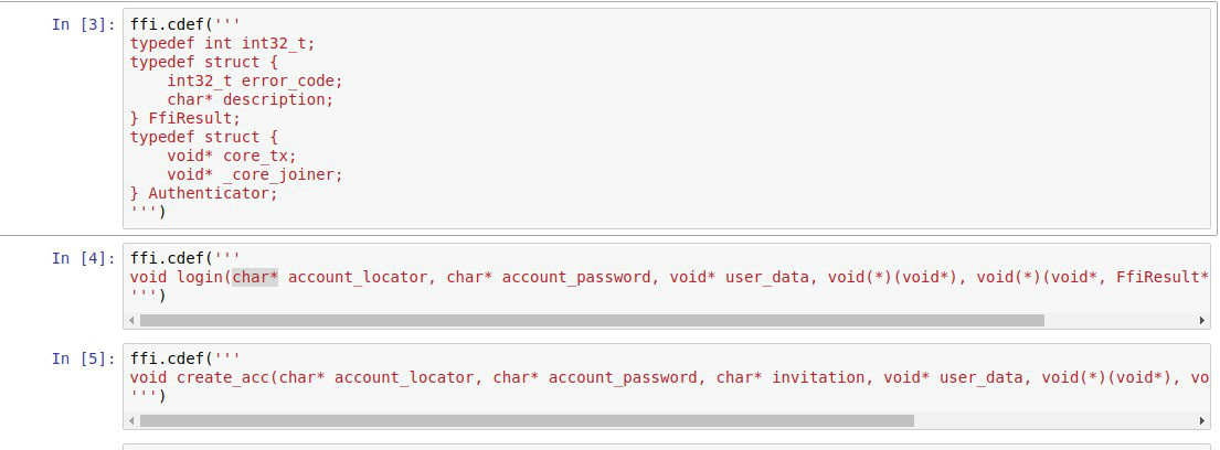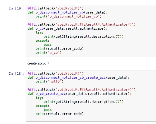 Correct, functions don’t return values as usual – but they don’t modify the provided structures either. safe_authenticator was coded in that way first but after lots of iterations we have came to the current way of returning values through callbacks – which are that void (*o_cb)(...) thing you’re seeing in each and every FFI function. This approach turned out to be quite robust and doesn’t require you to manage memory manually. And it has an extra bonus of handling asynchronous calls automatically.
